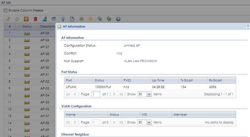 If the limited status is due to “VLAN LAN PROVISION”, it’s a known issue recently been found on controller that limited AP status occurs after AP upgraded firmware. But it will not impact the service and it has been resolved, we can provide you controller firmware to upgrade. Please arrange schedule to upgrade and reboot all APs to clear status or it will keep wrong display.