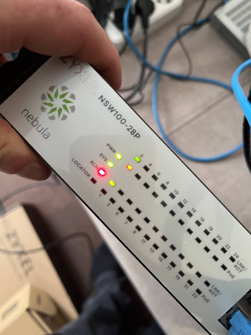 If the system LED is blinking green with the alarm LED blinking red, it means the NSW cannot connect to the Nebula Control Center.