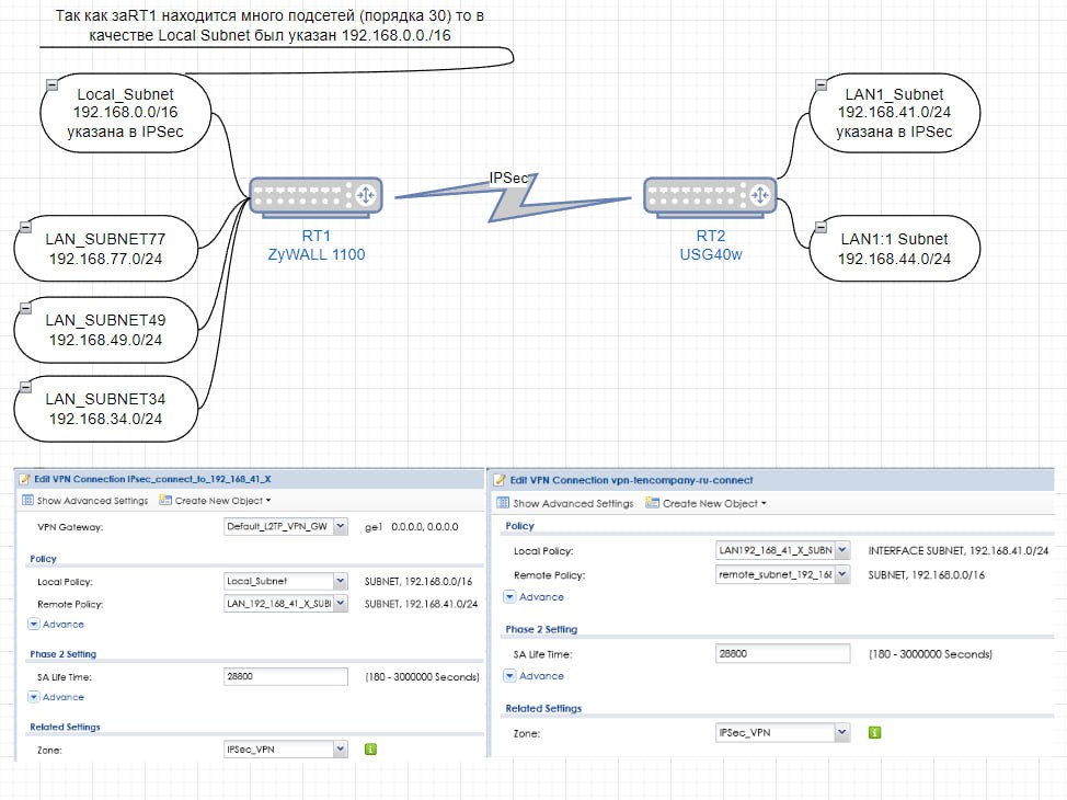 Коллеги добрый день. такой вопрос: есть 2 роутера [RT1 ZyWALL 1100] Выполняет функцию центрального VPN сервера и удаленная площадка [RT2 USG40] между ними IPSec. все работает, за каждым из роутеров есть несколько подсетей, возможно ли сделать так чтобы маршруты из других подсетей (которые не описаны в IPSec) маршрутизировались через IPSec тунель..? или для каждой подсети делать отдельный IPSec ?