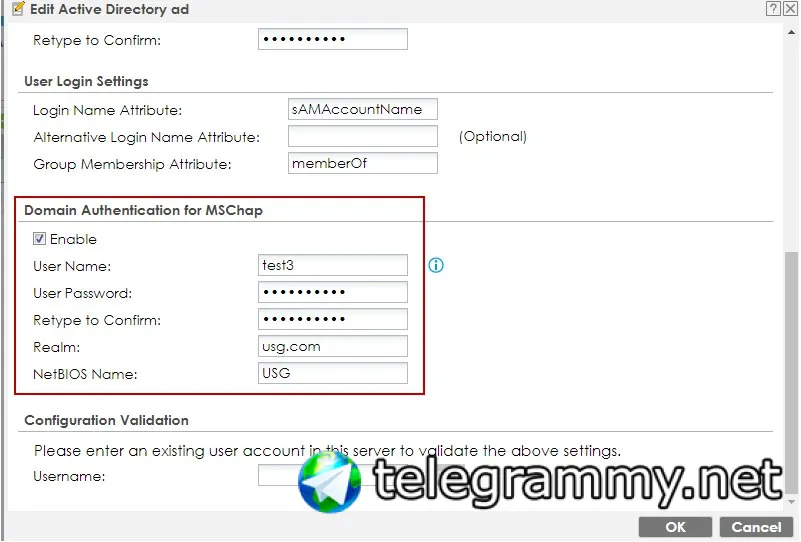 Пользователи AD могут залогиниться на Zywall (через web-интерфейс), также подключаются нормально через SSL-VPN, но при подключении через L2TP выдает "User i.testov has been denied from L2TP service.(Incorrect Username or Password)" при этом логин-пароль точно правильные.
