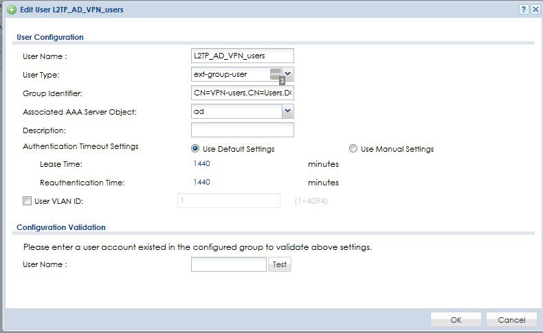2.Создал пользователя L2TP-VPN-AD (тип ext-group-user) (Тест проходит нормально, полльзователи в АД-группе VPN, проходят тест, остальные нет)